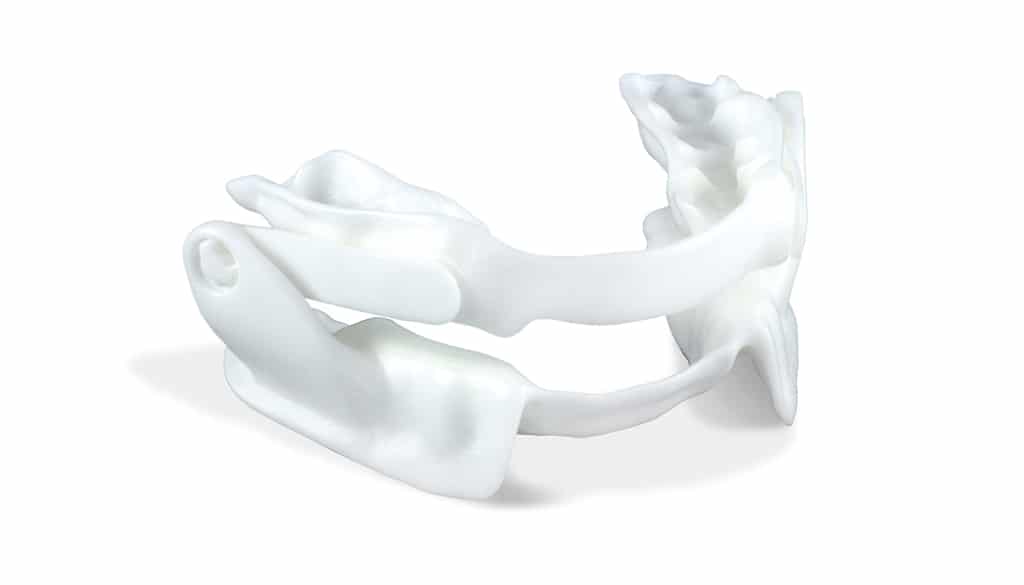 The device has been designed to maintain the lower jaw in a forward position. The advancement of the jaw increases the diameter of the airway, thus improving the airflow so one can actually breathe clearly.
